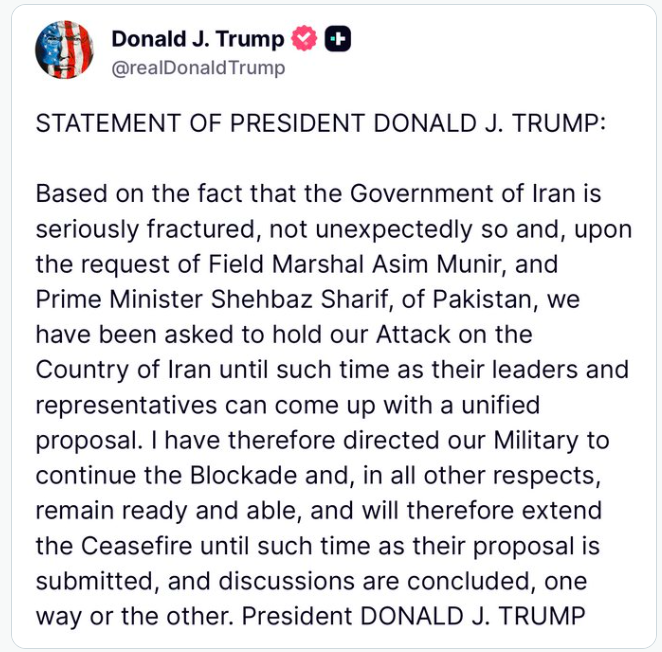 In a statement shared on Truth Social, Trump said the decision came amid internal divisions within the Iranian government and followed requests from Asim Munir and Shehbaz Sharif. He noted that the United States agreed to pause any military action to give Iran’s leadership time to present a unified proposal.